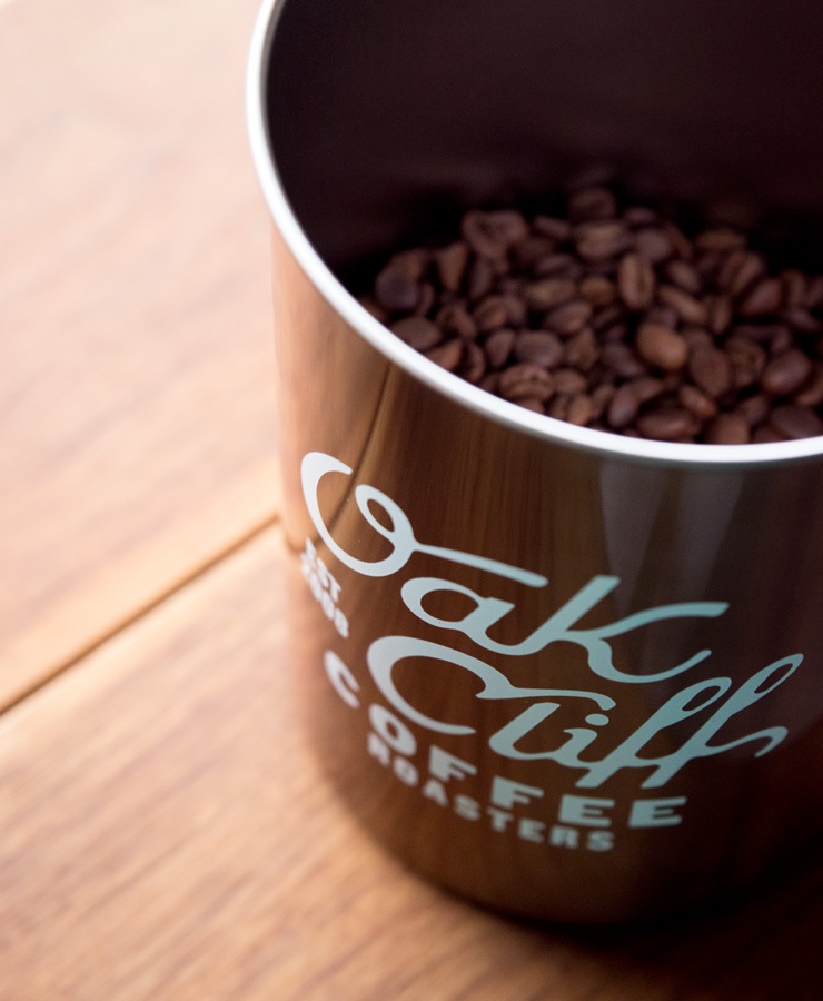 - Sleek white ceramic exterior with iconic Oak Cliff Coffee branding in blue